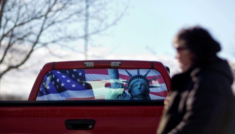 Изображение флага США и статуи Свободы на заднем стекле автомобиля в Манчестере. Архивное фотоДмитрий КосыревВсе материалы