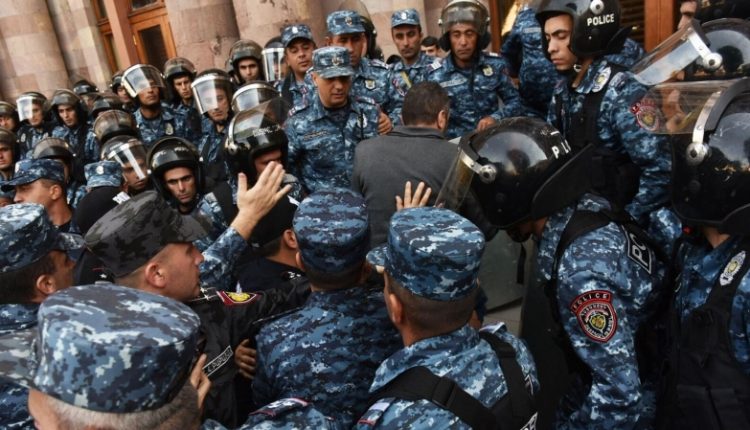 Сотрудники полиции во время протеста в Ереване из-за эскалации в Нагорном Карабахе